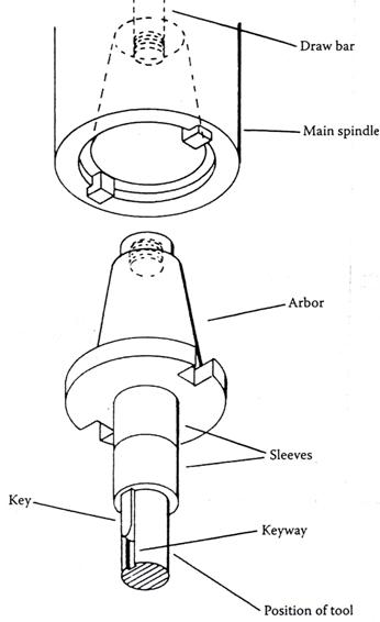 La frezarea orizontala sculele sunt montate pe un dorn sau arbore (figura 3.34) si sunt stranse cu o cheie. Arborele are o sectiune conica, care este proiectata pentru a se potrivi intr-un alezaj conic conjugat din capatul arborelui principal al masinii unelte. O tija trece prin alezajul arborelui principal din partea superioara si se insurubeza in capatul arborelui, rezultand o fixare cu strangere in locasul arborelui. Pe capatul liber al arborelui este prevazuta o zona de montaj a rulmentului, asa cum se vede in figura 3.30.