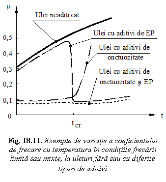 la uleiul cu aditivi de onctuozitate cum sunt acizii grasi (oleic, palmitic, stearic, lauric etc.), se formeaza chiar la temperaturi mici un strat aderent de sapunuri metalice, care asigura un coeficient de frecare scazut pana la temperatura de inmuiere si apoi de topire a acestor sapunuri, tcr;