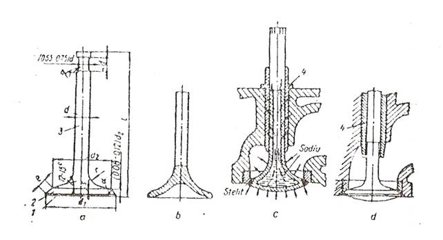 La motoarele puternice solitcitate termic, supapele de evacuare se pot supraincalzi. Pentru indepartarea acestui pericol, supapele de evacuare sunt executate cu cavitati in tija si in taler, care se umplu partial cu sodiu (fig. 1.4,c) sau alte substante cu punct de topire scazut pentru a transporta (in stare lichida) caldura de la talerul fierbinte la tija.