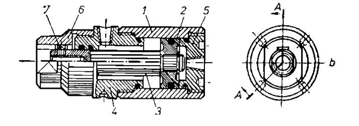 Motorul se leaga de dispozitiv prin intermediul unei tije, insurubata in tija 3 si a unei bucse de presiune 6, insurubata pe capacul din fata 4.Bucsa de presiune este impiedicata sa se roteasca in timpul procesului prin intermediul surubului 7.Aceste componente sunt introduse in corpul 1 inchis prin capacele 4,5, 6.