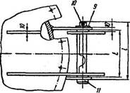 Fig 1.41 . Gura de vizitare cu capac plan rabqatabil: a- vedere; b- balama; c- bolt; 1- racord; 2-flansa; 3- garnitura; 4- capac; 5 ,6- surub, piulita; 7- balama; 8- splint; 9- saiba; 10-maner; 11- bolt.
