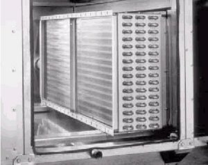 - O baterie de condensare realizata din tevi din otel lise, care formeaza un ansamblu de serpentine. Alimentarea serpentinelor se realizeaza printr-un distribuitor orizontal amplasat in partea superioara a serpentinelor, iar evacuarea condensului se realizeaza printr-un colector de asemenea orizontal, amplasat in partea inferioara a serpentinelor. Bateria de condensare este inchisa intr-o carcasa din tabla, care formeaza un canal de curgere pentru aer. In cazul utilizarii amoniacului, aceasta baterie este precedata de una realizata din tevi nervurate, pentru desupraincalzirea vaporilor.