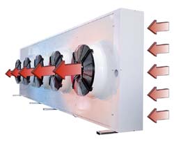 - Un ventilator axial sau centrifugal, care circula fortat aerul atmosferic de jos in sus, pest tevi. La iesirea din aparat se monteaza un separator de picaturi, pentru a limita pierderea de apa.
