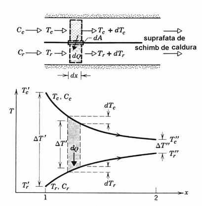 Cele doua fluide ce evolueaza in schimbatorul de caldura au fost notate astfel: fluidul cald cu indicele "c" si fluidul rece cu indicele "r". Aplicand bilantul energetic pe fiecare din elementele infinitezimale (fig. 7.46), rezulta