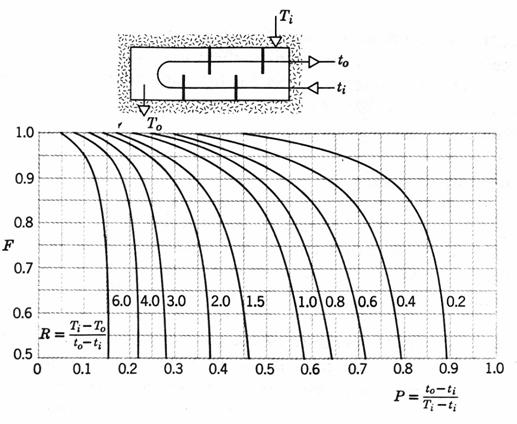 Pentru a determina coeficientul de corectie F din figura 7.49 se calculeaza parametrii R si P (se utilizeaza notatiile din figura)