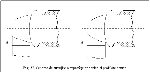 Pentru suprafetele conice lungi, avansul cutitului si al barei trebuie sa aiva valori constante. Suprafetele conice si profilate scurte dispuse aproape de luneta, se pot prelucra numai cu avansul radial al cutitului profilat, ca in fig.27.