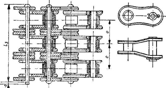 In cazul unor sarcini mari se folosesc lanturile cu mai multe randuri de zale(fig.2.7) executate din aceleasi elemente ca si cele, cu un singur rand, insa cu bolturile de lungime mai mare. Numarul de randuri poate fi 2 sau 3.