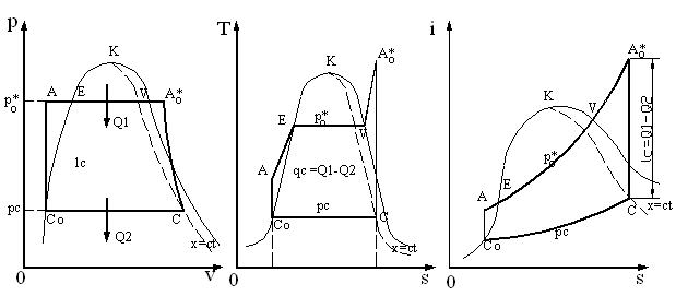 Acest ciclu poarta numele de ciclu Clausius - Rankine. Reprezentarea sa in diagramele p - v, T - s si i -s este data in fig. 14. In diagrama p - v aria cuprinsa intre transformarile ciclului este proportionala cu lucrul mecanic produs in ciclu de 1kg. de fluid. In diagrama T - s aria ciclului este proportionala cu caldura transformata in lucru mecanic, si anume aria de sub izobara AEVA0* fiind proportionala cu Q1 - caldura primita in cazan, iar aria de sub izobara CCo fiind proportionala cu Q2 - caldura cedata in condensator. In diagrama i -s se pot evidentia diferentele de entalpie intre care au loc transformarile ciclului, care sunt proportionale cu segmentele determinate de proiectiile lor pe ordonata 0i, ceea ce pentru transformarile izentropice, care sunt reprezentate prin segmente verticale, inseamna ca diferenta de entalpie in aceste cazuri este proportionala chiar cu lungimea segmentelor transformarilor.